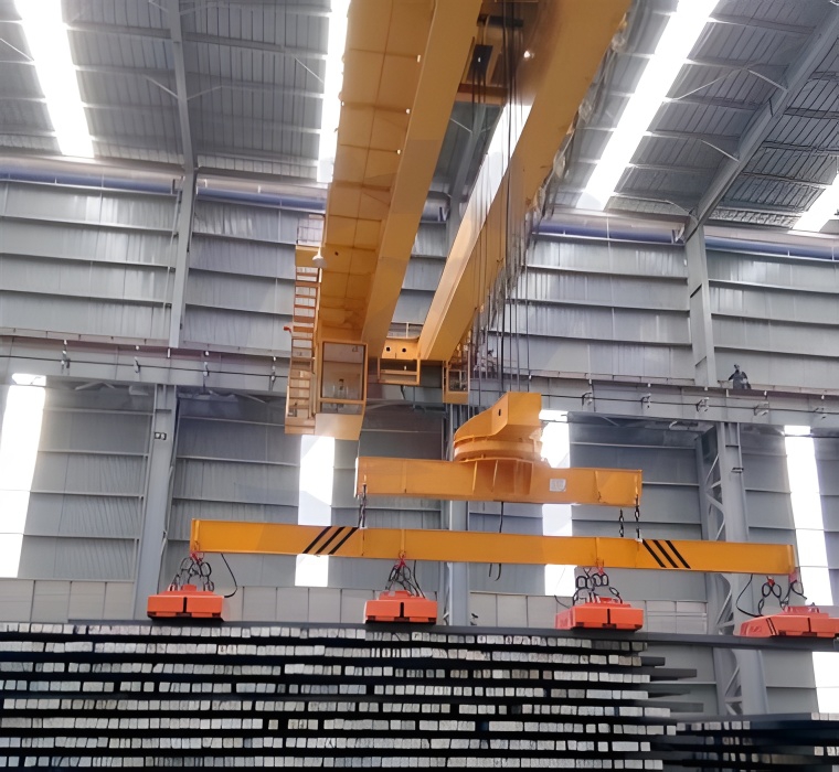主要用于鋼廠、船廠、港口、貨場等室內(nèi)或露天的固定跨間,裝卸及搬運(yùn)各種超長的型材物料等。